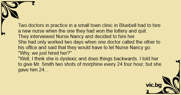 She had only worked two days when one doctor called the other to his office and said that they would have to let Nurse Nancy go.