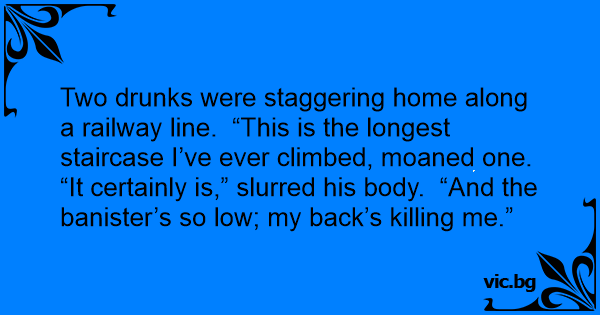 Two drunks were staggering home along a railway line. “This is the longest staircase I’ve ever climbed, moaned one.