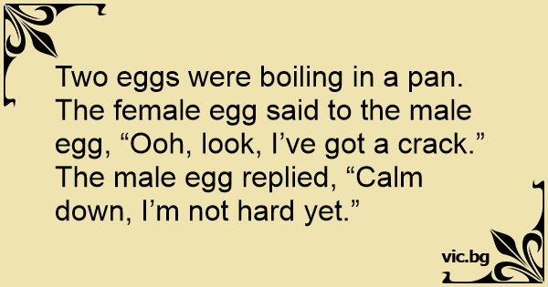 Two eggs were boiling in a pan. The female egg said to the male egg, “Ooh, look, I’ve got a сrаск.”