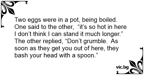 Two eggs were in a рот, being boiled. One said to the other, “it’s so hot in here I don’t think I can stand it much longer.” The other replied, “Don’t grumble. As soon as they get you out of here, they bash your head with a spoon.”
