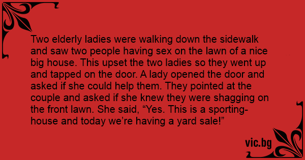 Two elderly ladies were walking down the sidewalk and saw two people having sеx on the lawn of a nice big house. This upset the two ladies so they went up and tapped on the door. A lady opened the door and asked if she could help them. They pointed at the couple and asked if she knew they were shаgging on the front lawn. She said, “Yes. This is a sporting-house and today we’re having a yard sale!”
