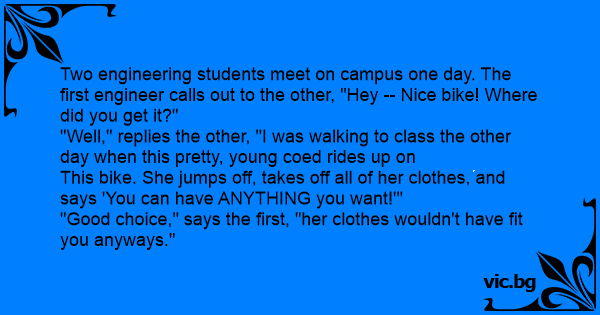 Two engineering students meet on campus one day. The first engineer calls out to the other, "Hey -- Nice bike! Where did you get it?"