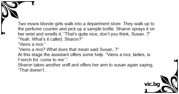 Two essex blonde girls walk into a department store. They walk up to the perfume counter and pick up a sample bottle. Sharon sprays it on her wrist and smells it, “That’s quite nice, don’t you think, Susan..?”