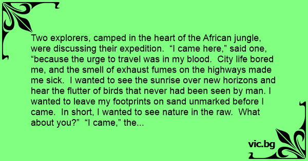 Two explorers, camped in the heart of the African jungle, were discussing their expedition. “I came here,” said one, “because the urge to travel was in my blood. City life bored me, and the smell of exhaust fumes on the highways made me sick. I wanted to see the sunrise over new horizons and hear the flutter of birds that never had been seen by man. I wanted to leave my footprints on sand unmarked before I came. In short, I wanted to see nature in the raw. What about you?” “I came,” the second man replied, “because my son was taking saxophone lessons.”