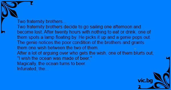 Two fraternity brothers decide to go sailing one afternoon and become lost. After twenty hours with nothing to eat or drink, one of them spots a lamp floating by. He picks it up and a genie pops out. The genie notices the poor condition of the brothers and grants them one wish between the two of them.