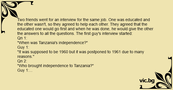 Two friends went for an interview for the same job. One was educated and the other wasn't, so they agreed to help each other. They agreed that the educated one would go first and when he was done, he would give the other the answers to all the questions. The first guy's interview started: