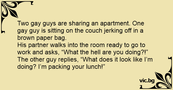 Two gаy guys are sharing an apartment. One gаy guy is sitting on the couch jerking off in a brown paper bag.