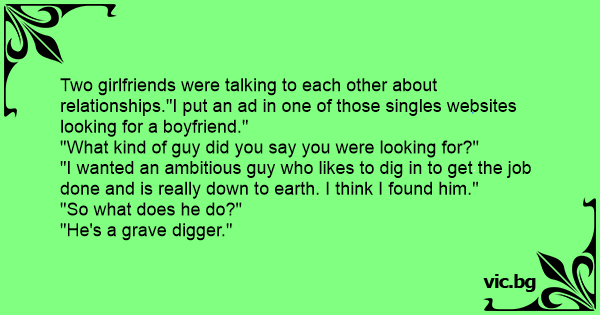 Two girlfriends were talking to each other about relationships."I put an ad in one of those singles websites looking for a boyfriend."