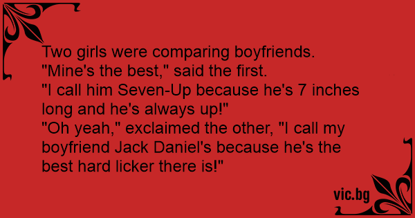 "Oh yeah," exclaimed the other, "I call my boyfriend Jack Daniel's because he's the best hard licker there is!"