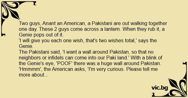 The Pakistani said, 'I want a wall around Pakistan, so that no neighbors or infidels can come into our Ракi land.' With a blink of the Genie's eye, 'РООF' there was a huge wall around Pakistan.