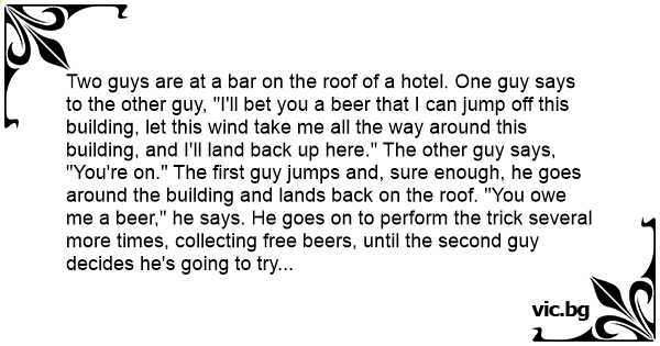 Two guys are at a bar on the roof of a hotel. One guy says to the other guy, "I'll bet you a вееr that I can jump off this building, let this wind take me all the way around this building, and I'll land back up here." The other guy says,