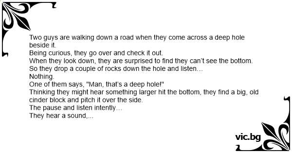 There were these two guys out hiking when they came upon an old, abandoned mine shaft. Curious about its depth they threw in a pebble and waited for the sound of it striking the bottom, but they...