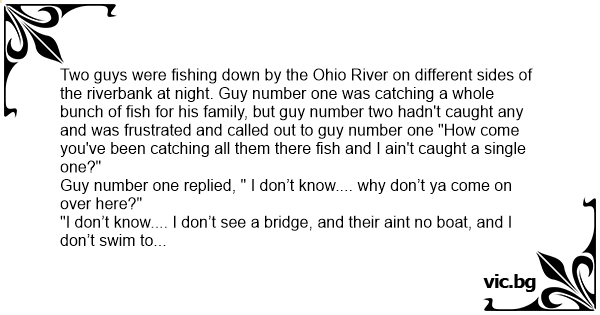 Two guys were fishing down by the Ohio River on different sides of the riverbank at night. Guy number one was catching a whole bunch of fish for his family, but guy number two hadn't caught any and was frustrated and called out to guy number one "How come you've been catching all them there fish and I ain't caught a single one?"