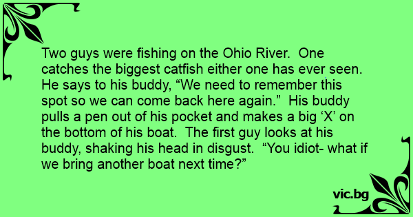 Two guys were fishing on the Ohio River. One catches the biggest catfish either one has ever seen. He says to his buddy, “We need to remember this spot so we can come back here again.” His buddy pulls a pen out of his pocket and makes a big ‘X’ on the bottom of his boat. The first guy looks at his buddy, shaking his head in disgust. “You idiот- what if we bring another boat next time?”