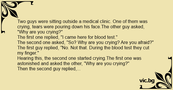 Сидить маленька дівчинка в лікарні й плаче. Підходить до неї хлопчик: — Чому ти плачеш? — Я прийшла робити аналіз крові й мені палець відріжуть. Хлопчик заплакав ще сильніше за дівчинку. — А ти чому плачеш? — запитала дівчинка. — А я прийшов аналіз сечі здавати…