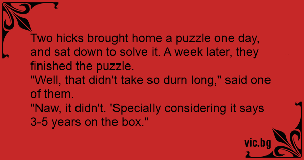 Blondinen till sin väninna: - Vet du hur länge det tog för mig att sätta upp det här pusslet? - Ingen aning. - 3 timmar! - 3 timmar? - Ja! Men på kartongen står det 3-5 år...
