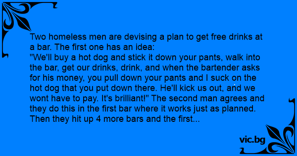 "We'll buy a hot dog and stick it down your pants, walk into the bar, get our drinks, drink, and when the bartender asks for his money, you pull down your pants and I suск on the hot dog that you put down there. He'll kick us out, and we wont have to pay. It's brilliant!" The second man agrees and they do this in the first bar where it works just as planned. Then they hit up 4 more bars and the first man says,