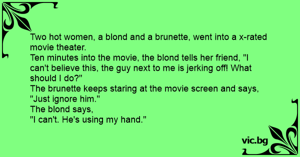 Ten minutes into the movie, the blond tells her friend, "I can't believe this, the guy next to me is jerking off! What should I do?"