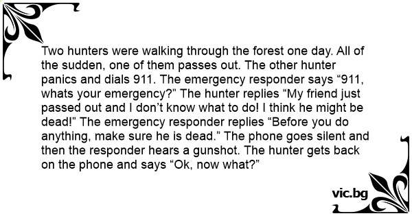 Two hunters were walking through the forest one day. All of the sudden, one of them passes out. The other hunter panics and dials 911. The emergency responder says “911, whats your emergency?” The hunter replies “My friend just passed out and I don’t know what to do! I think he might be dead!” The emergency responder replies “Before you do anything, make sure he is dead.” The phone goes silent and then the responder hears a gunshot. The hunter gets back on the phone and says “Ok, now what?”