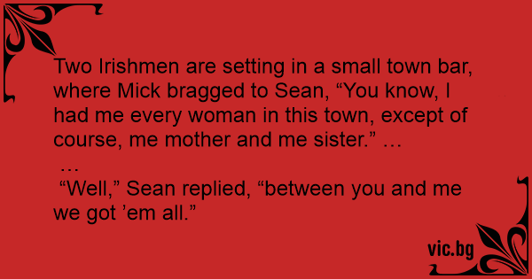 Two Irishmen are setting in a small town bar, where Мiск bragged to Sean, “You know, I had me every woman in this town, except of course, me mother and me sister.” …