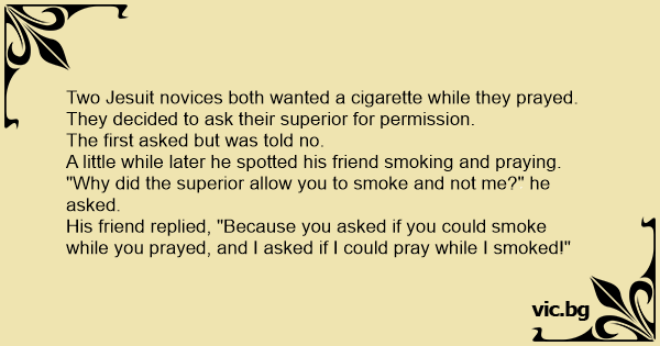 A little while later he spotted his friend smoking and praying. "Why did the superior allow you to smoke and not me?" he asked.