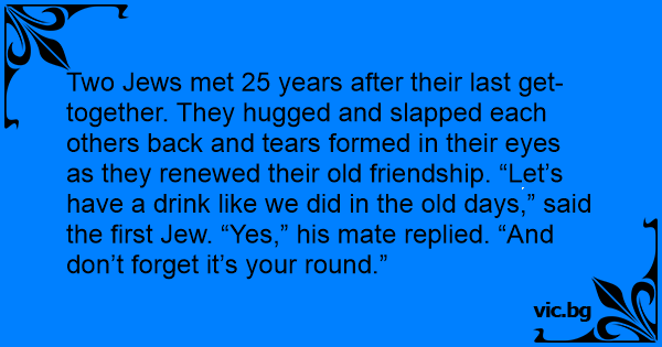 Two Jews met 25 years after their last get-together. They hugged and slapped each others back and tears formed in their eyes as they renewed their old friendship. “Let’s have a drink like we did in the old days,” said the first Jew. “Yes,” his mate replied. “And don’t forget it’s your round.”