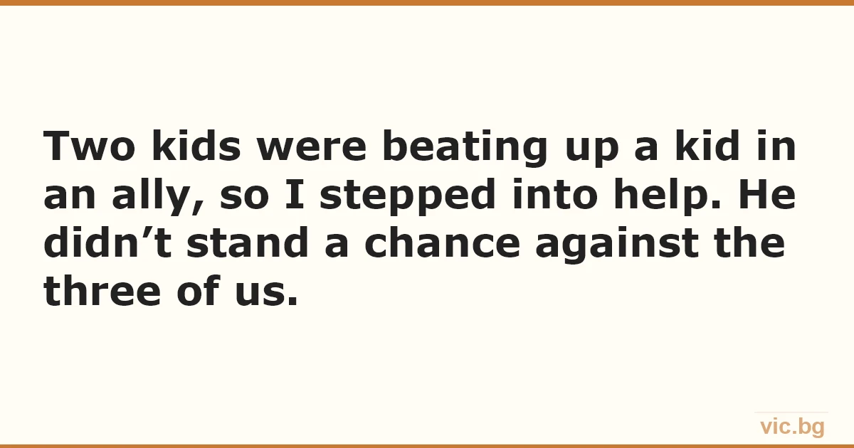 Two kids were beating up a kid in an ally, so I stepped into help. He didn’t stand a chance against the three of us.