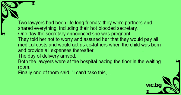 Two lawyers had been life long friends: they were partners and shared everything, including their hot-blooded secretary. One day the secretary announced she was pregnant. They told her not to worry and assured her that they would pay all medical costs and would act as co-fathers when the child was born and provide all expenses thereafter. The day of delivery arrived. Both the lawyers were at the hospital pacing the floor in the waiting room. Finally one of them said, “I can’t take this, I’m going down to sit in my car and wait there. Please come down and tell me as soon as the child is born!” The partner agreed to do that. About an hour later the partner approached the car with a very grave look on his face. “What happened?” asked the waiting car occupant. The other partner announced, “They were twins and mine died!”