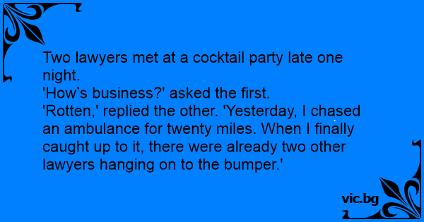 'Rotten,' replied the other. 'Yesterday, I chased an ambulance for twenty miles. When I finally caught up to it, there were already two other lawyers hanging on to the bumper.'