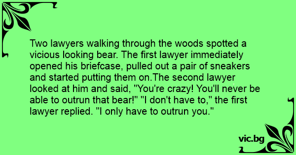 Two lawyers walking through the woods spotted a vicious looking bear. The first lawyer immediately opened his briefcase, pulled out a pair of sneakers and started putting them on.The second lawyer looked at him and said, "You're crazy! You'll never be able to outrun that bear!" "I don't have to," the first lawyer replied. "I only have to outrun you."