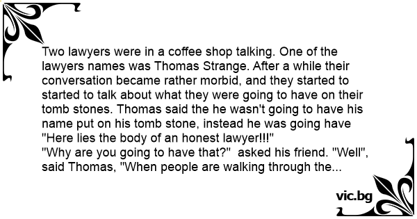Two lawyers were in a coffee shop talking. One of the lawyers names was Thomas Strange. After a while their conversation became rather morbid, and they started to started to talk about what they were going to have on their tomb stones. Thomas said the he wasn't going to have his name put on his tomb stone, instead he was going have "Here lies the body of an honest lawyer!!!"