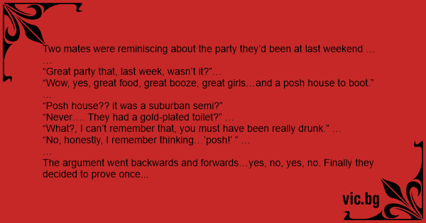 The argument went backwards and forwards…yes, no, yes, no. Finally they decided to prove once and for all who was correct…. They looked up the address and went to the house. A woman came to the door and one of the men said…”Excuse me, we were at your party last weekend and we’re having a difference of opinion, tell us please…have you, or have you not, got a gold-plated toilet? My mate here says ‘yes’ but I disagree.” …