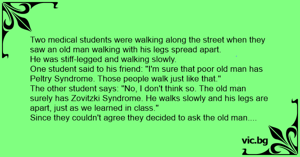 The other student says: "No, I don't think so. The old man surely has Zovitzki Syndrome. He walks slowly and his legs are apart, just as we learned in class."
