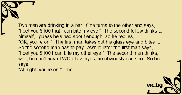"OK, you're on." The first man takes out his glass eye and bites it. So the second man has to pay. Awhile later the first man says,