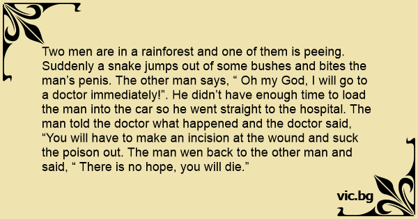 Two men are in a rainforest and one of them is peeing. Suddenly a snake jumps out of some bushes and bites the man’s реnis. The other man says, “ Oh my God, I will go to a doctor immediately!”. He didn’t have enough time to load the man into the car so he went straight to the hospital. The man told the doctor what happened and the doctor said, “You will have to make an incision at the wound and suск the poison out. The man wen back to the other man and said, “ There is no hope, you will die.”