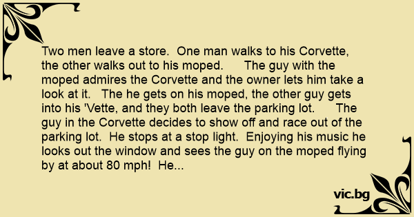 Two men leave a store. One man walks to his Corvette, the other walks out to his moped. The guy with the moped admires the Corvette and the owner lets him take a look at it. The he gets on his moped, the other guy gets into his 'Vette, and they both leave the parking lot. The guy in the Corvette decides to show off and race out of the parking lot. He stops at a stop light. Enjoying his music he looks out the window and sees the guy on the moped flying by at about 80 mph! He can't believe a moped can go that fast! So he races up to the guy on the moped and passes him again to show how fast he can go. At the next stop light, the guy on the moped speeds by once more. Finally the Corvette and moped stop at the same stop light.