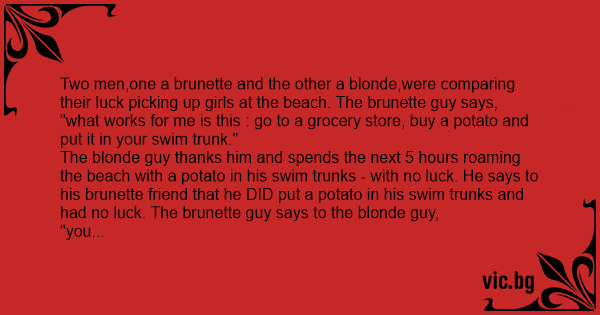The blonde guy thanks him and spends the next 5 hours roaming the beach with a potato in his swim trunks - with no luck. He says to his brunette friend that he DID put a potato in his swim trunks and had no luck. The brunette guy says to the blonde guy,