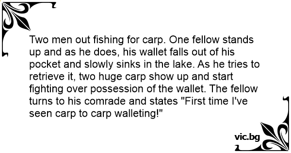 Two men out fishing for carp. One fellow stands up and as he does, his wallet falls out of his pocket and slowly sinks in the lake. As he tries to retrieve it, two huge carp show up and start fighting over possession of the wallet. The fellow turns to his comrade and states "First time I've seen carp to carp walleting!"