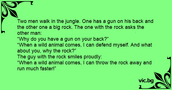 Two men walk in the jungle. One has a gun on his back and the other one a big rock. The one with the rock asks the other man: