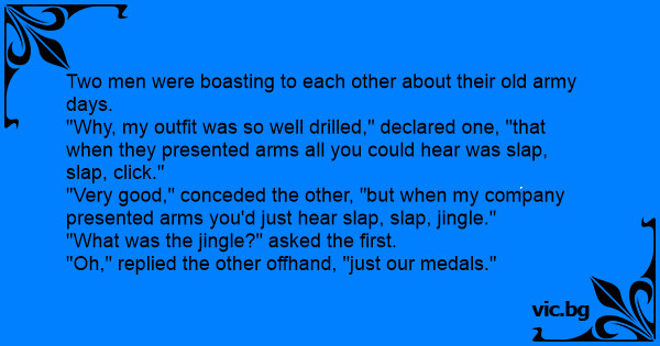 "Very good," conceded the other, "but when my company presented arms you'd just hear slap, slap, jingle."