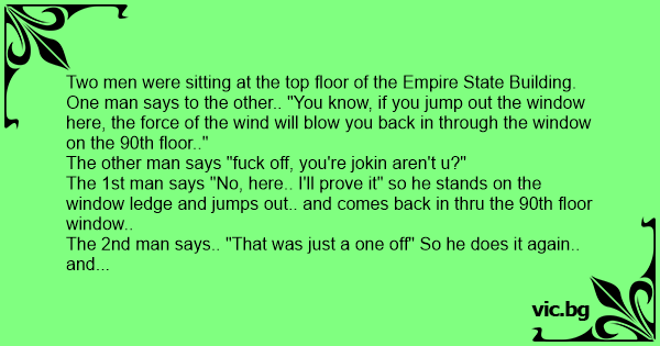 One man says to the other.. "You know, if you jump out the window here, the force of the wind will вlоw you back in through the window on the 90th floor.."