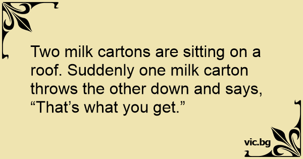 Two milk cartons are sitting on a roof. Suddenly one milk carton throws the other down and says, “That’s what you get.”