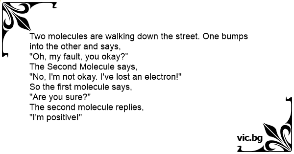 Two molecules are walking down the street. One bumps into the other and says,