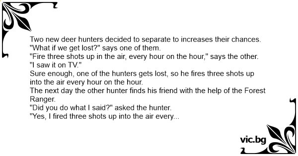 There were two hunters who had never hunted before, so they took a hunters safety course. In this course it was stressed that if you ever got lost in the woods, firing three shots in the air was...