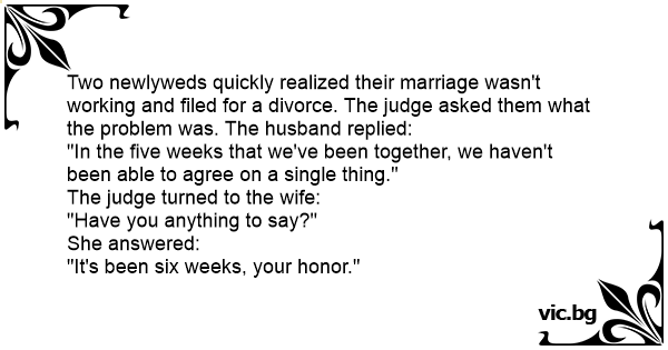 Two newlyweds quickly realized their marriage wasn't working and filed for a divorce. The judge asked them what the problem was. The husband replied: