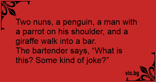Two nuns, a реnguin, a man with a parrot on his shoulder, and a giraffe walk into a bar.