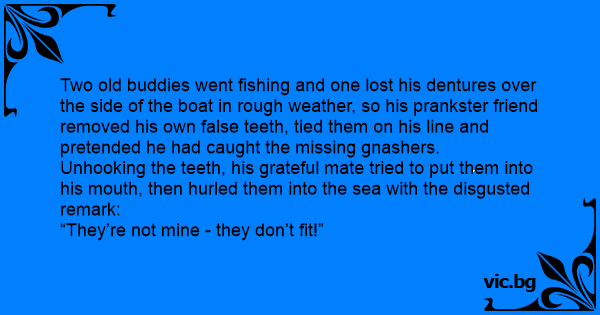 Two old buddies went fishing and one lost his dentures over the side of the boat in rough weather, so his prankster friend removed his own false teeth, tied them on his line and pretended he had caught the missing gnashers.
