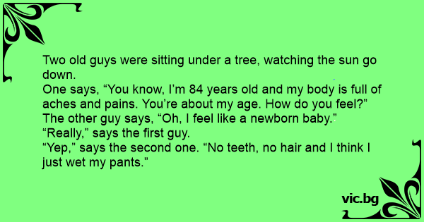 One says, “You know, I’m 84 years old and my body is full of aches and pains. You’re about my age. How do you feel?”