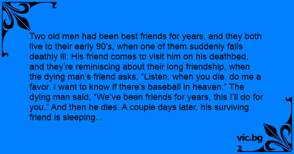 Two old men had been best friends for years, and they both live to their early 90′s, when one of them suddenly falls deathly ill. His friend comes to visit him on his deathbed, and they’re reminiscing about their long friendship, when the dying man’s friend asks, “Listen, when you die, do me a favor. I want to know if there’s baseball in heaven.” The dying man said, “We’ve been friends for years, this I’ll do for you.” And then he dies. A couple days later, his surviving friend is sleeping when he hears his friend’s voice. The voice says, “I’ve got some good news and some bad news. The good news is that there’s baseball in heaven.” “What’s the bad news?” “You’re pitching on Wednesday.”