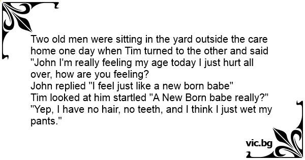 Two old men were sitting in the yard outside the care home one day when Tim turned to the other and said "John I'm really feeling my age today I just hurt all over, how are you feeling?